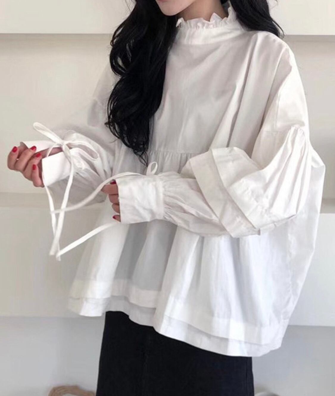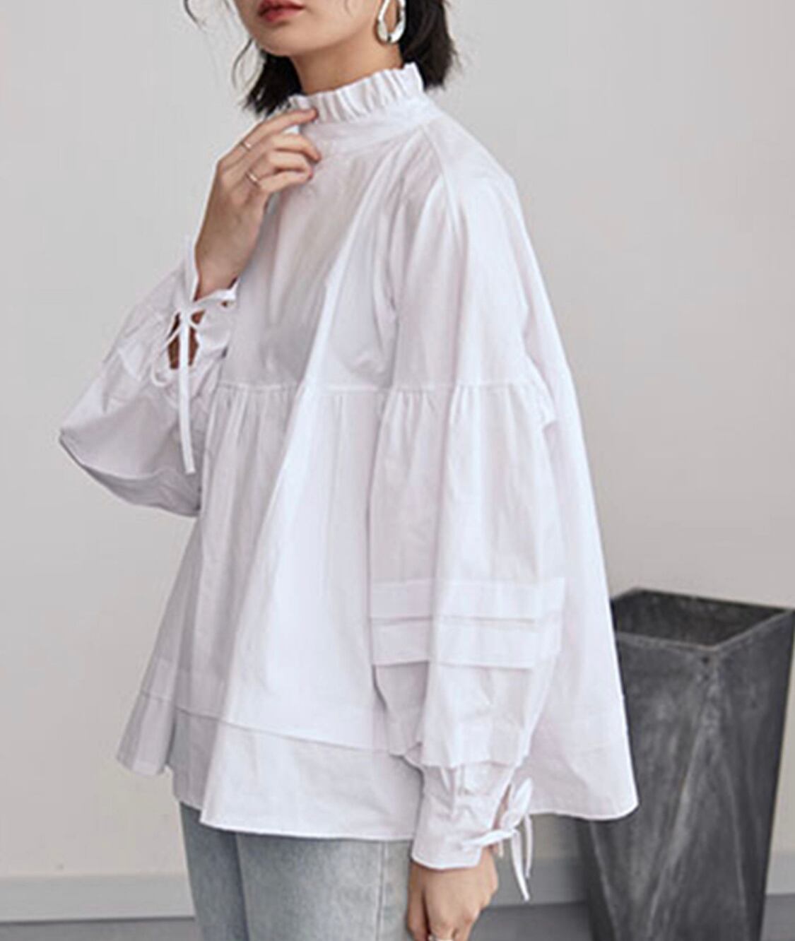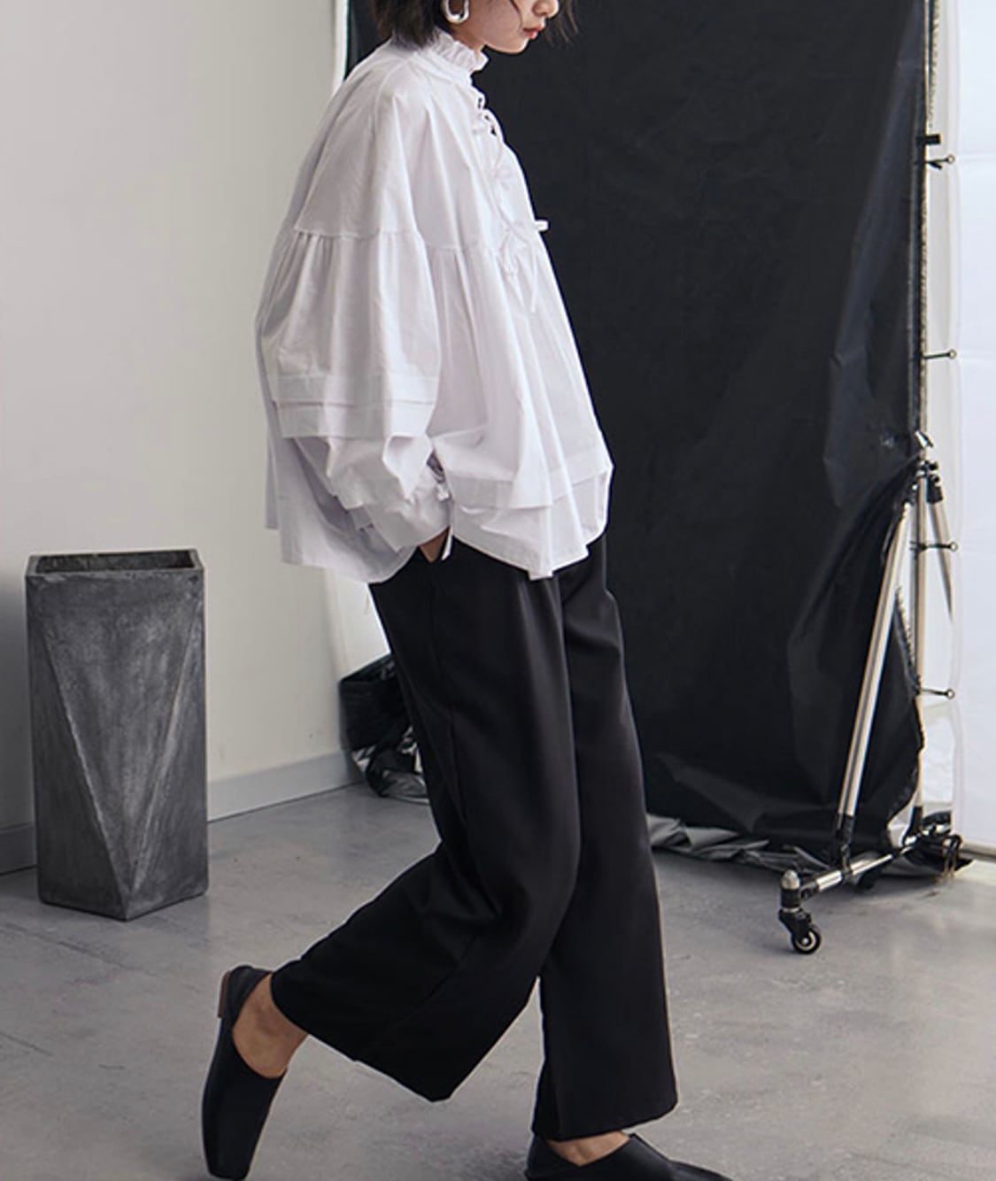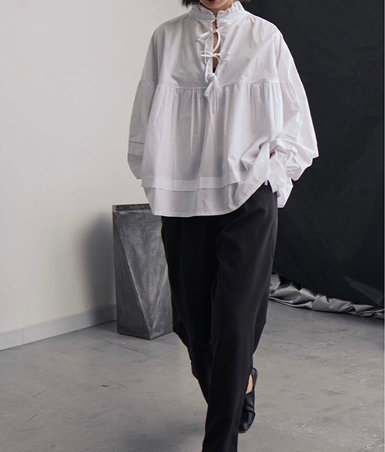 フリルネックとフレアのボリュームが、エレガントな印象のブラウス。
