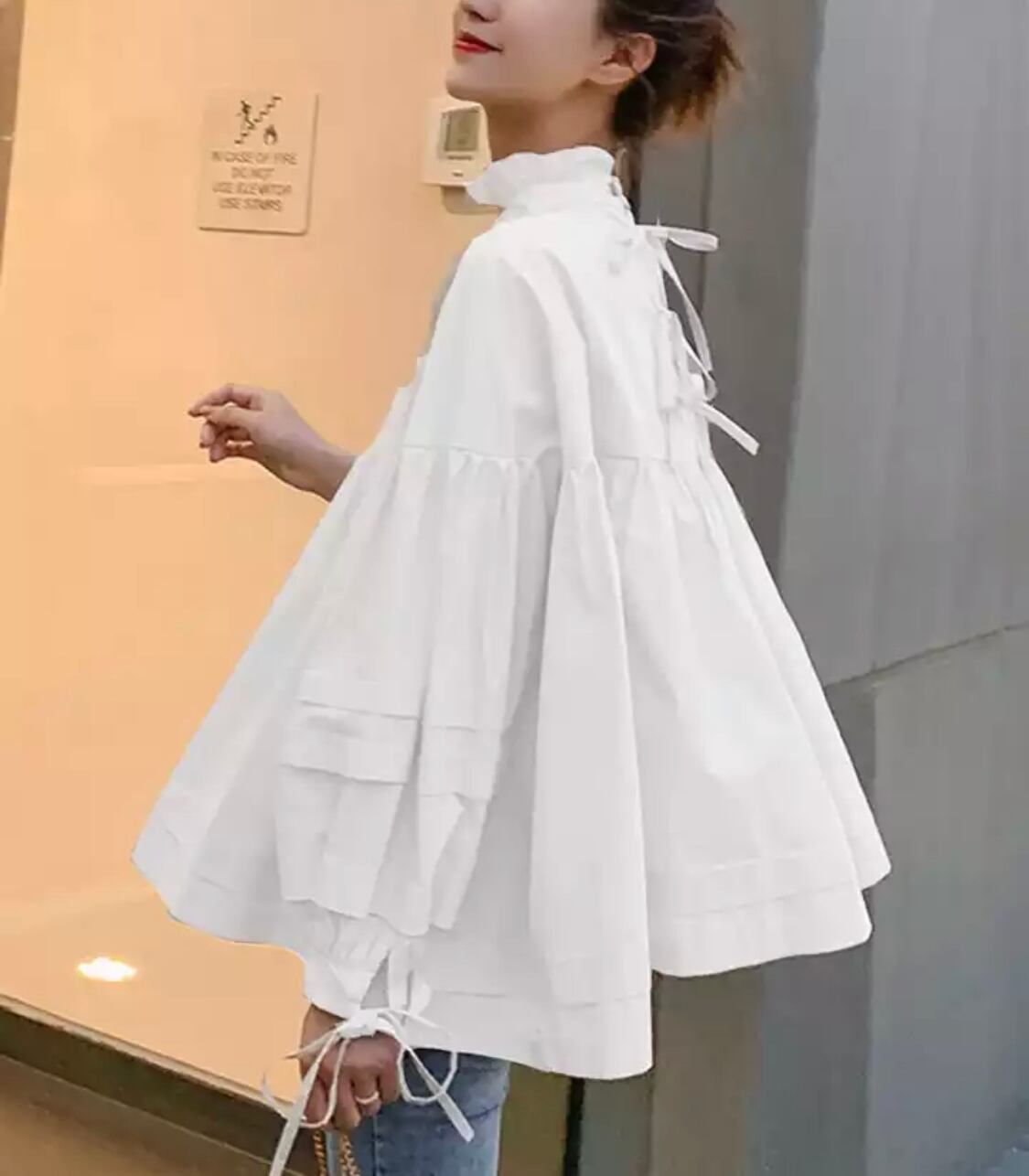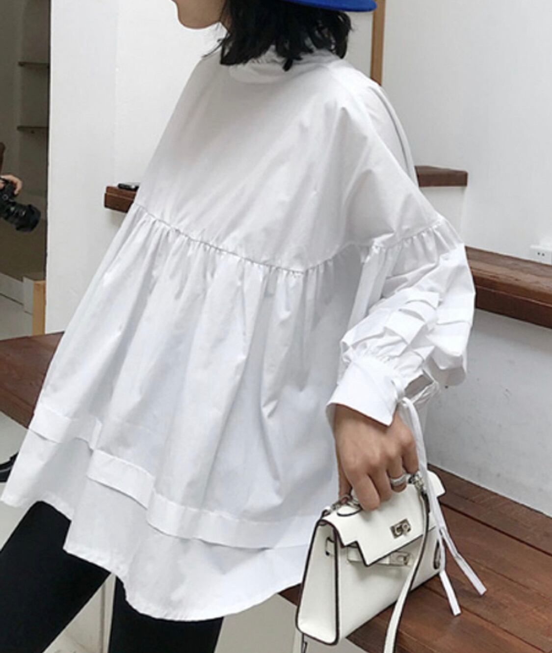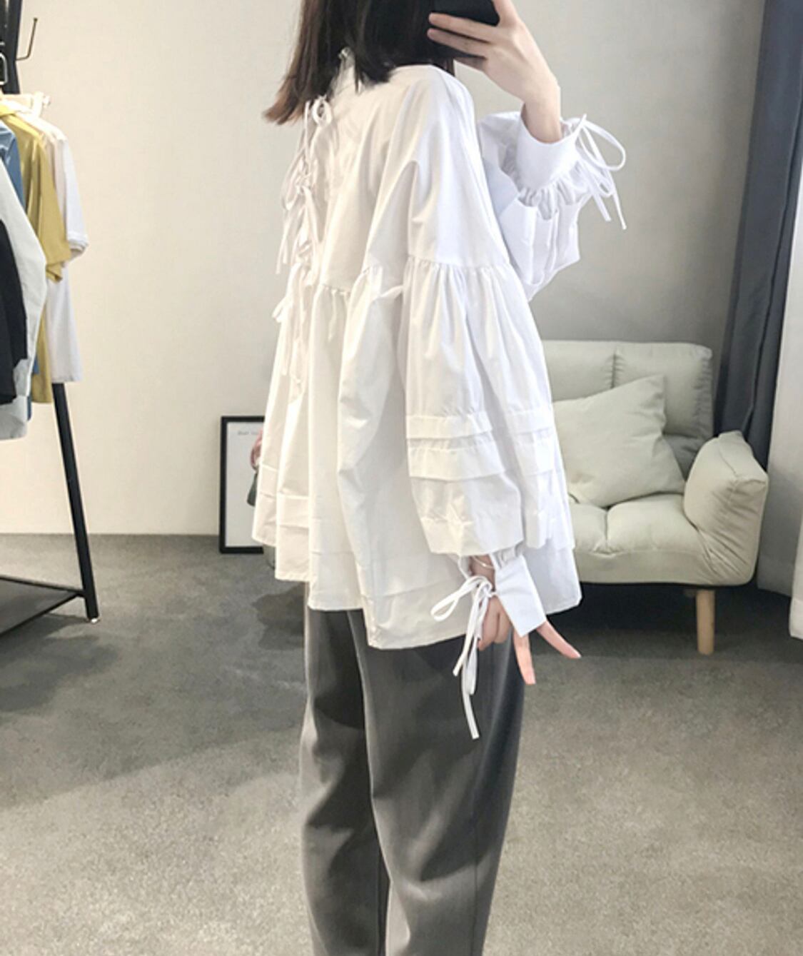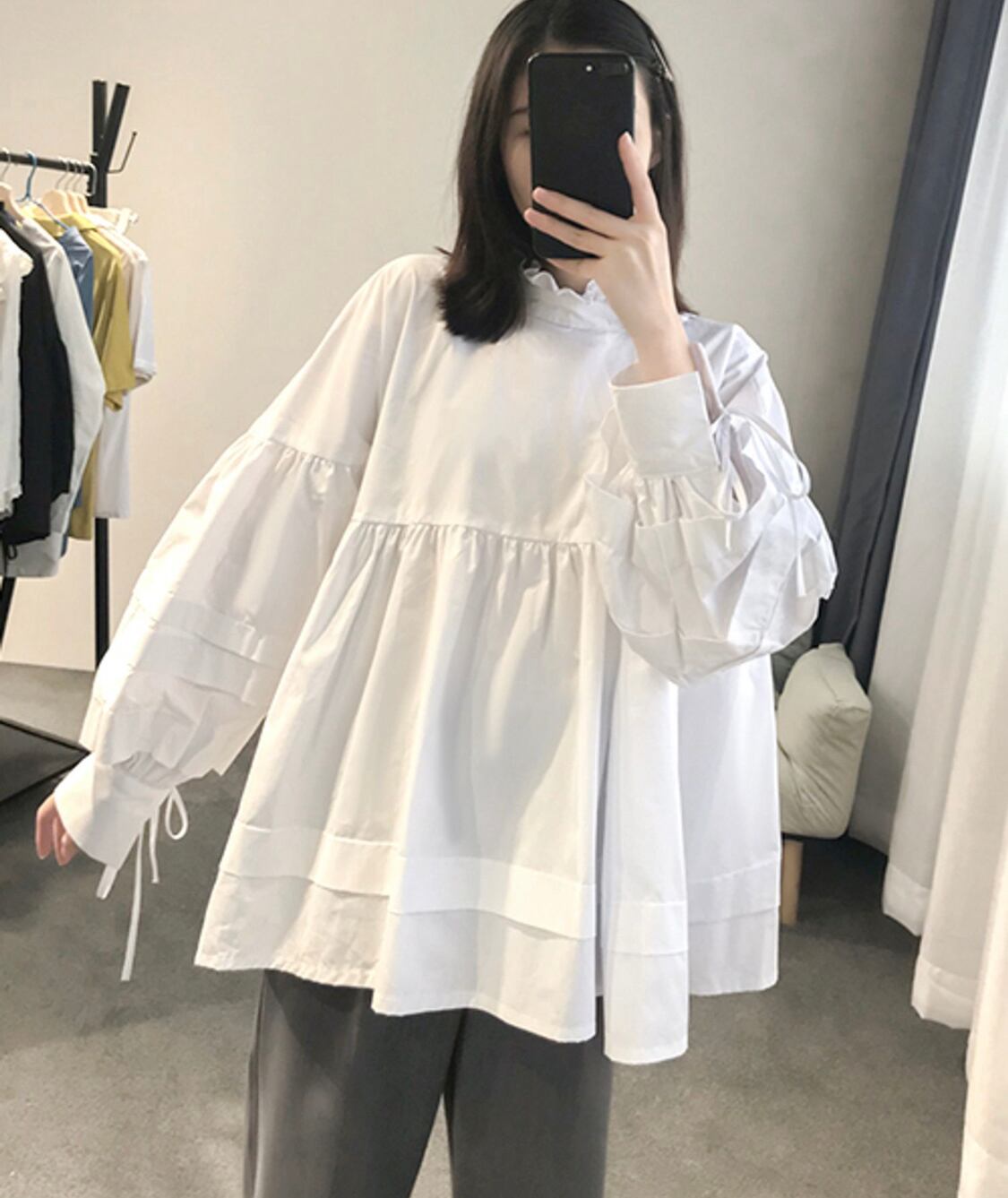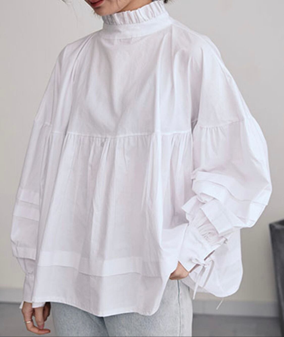 フリルネックとフレアのボリュームが、エレガントな印象のブラウス。