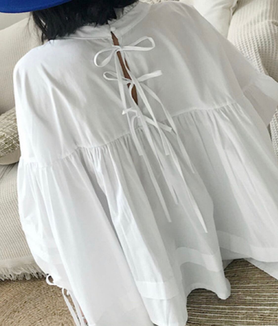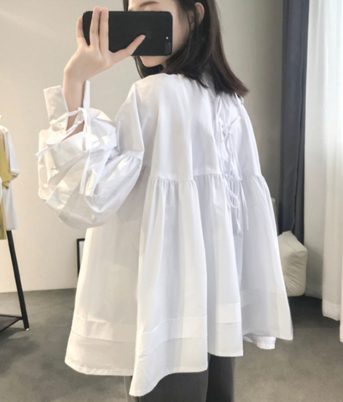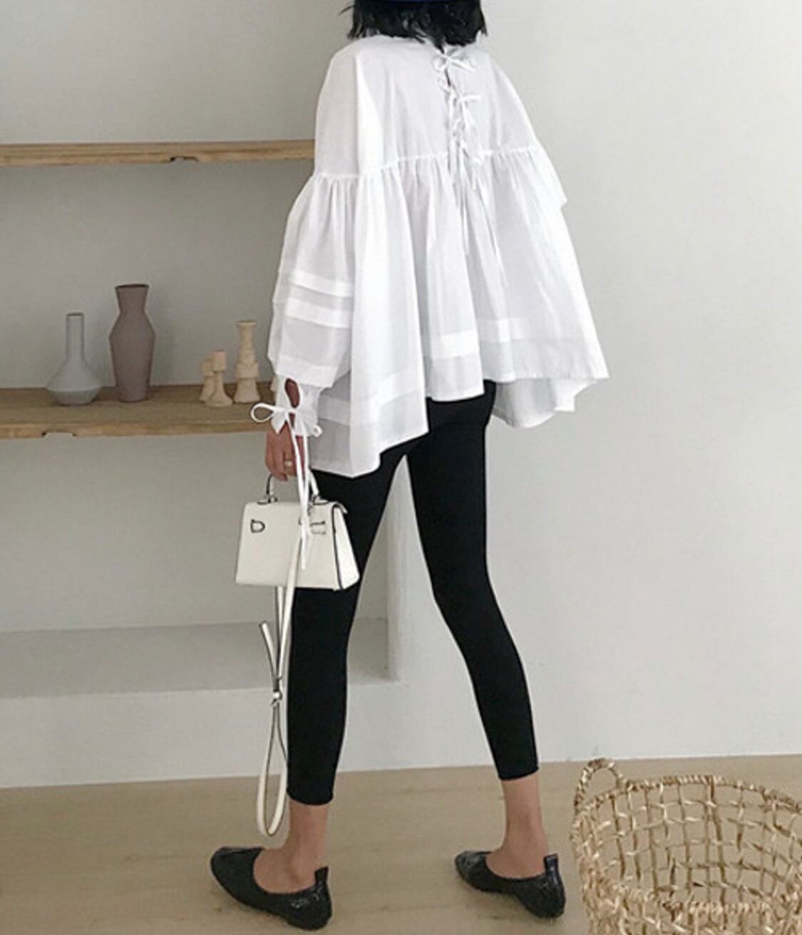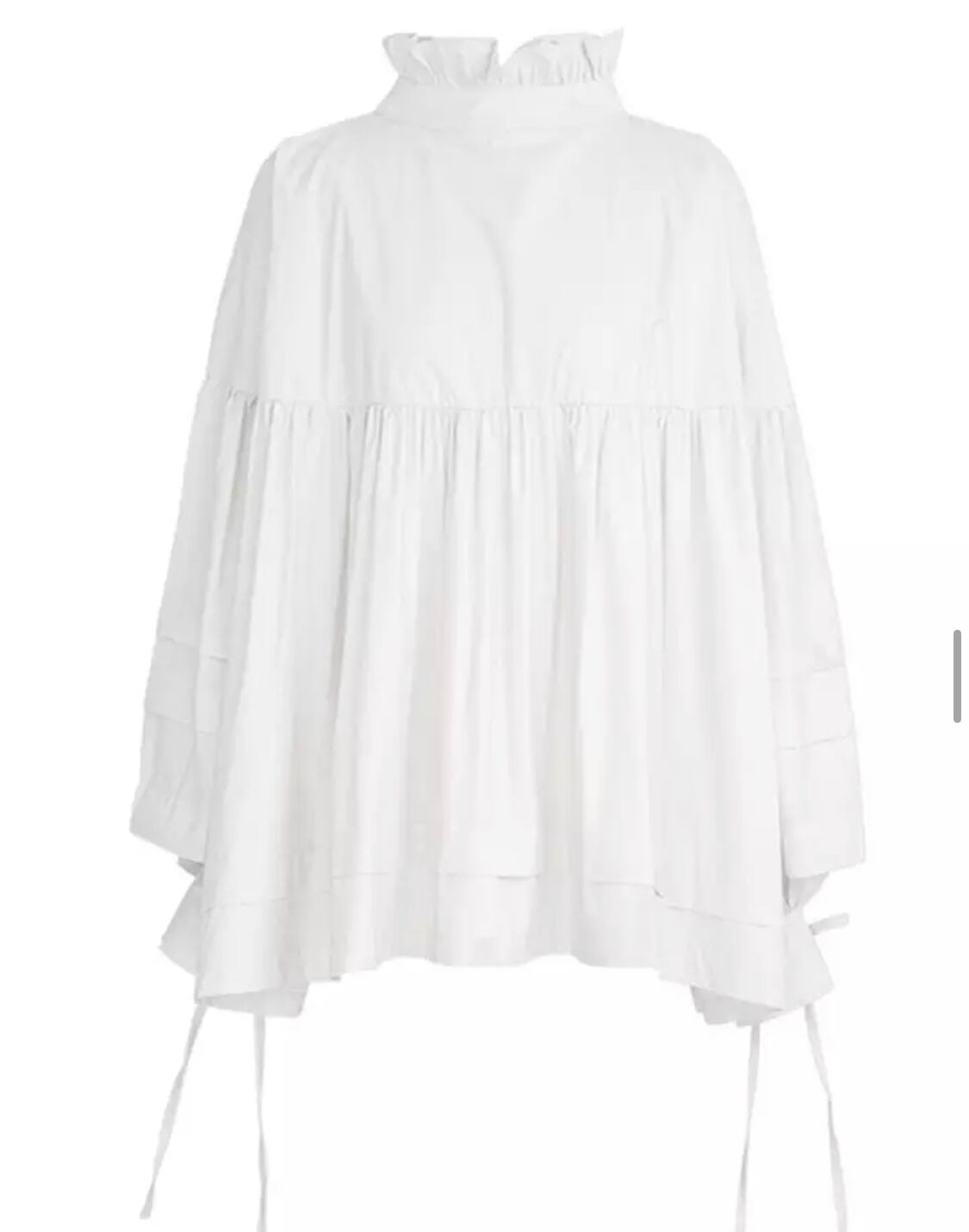 フリルネックとフレアのボリュームが、エレガントな印象のブラウス。